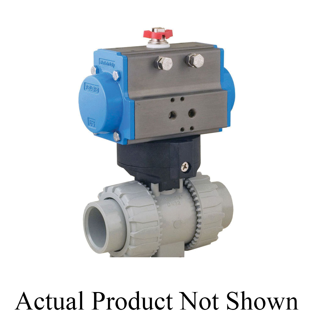 The valve body, stem, ball and unions shall be made of PVC compound which shall meet classification 12454 of ASTM D 1784 or the valve body, stem, ball and unions shall be made of CPVC compound and shall meet classification 23447 of ASTM D 1784. The ball seats shall be made of PTFE and the O-ring seals shall be made of EPDM. The PVC IPS/Socket connectors shall conform to the dimensional standards ASTM D2466 and ASTM D2467 and the CPVC shall conform to the dimensional standard ASTM F439. The NPT PVC connectors shall conform to the dimensional standards of ASTM D2464, ASTM F1498 and ANSI B1.20.1 thread depths. The NPT CPVC shall conform to ASTM F437, ASTM F1498 and ANSI B1.20.1 thread depths. The rack and pinion style pneumatic actuator body shall be made from hard anodized extruded aluminum, and shall incorporate adjustable side 0 to 90 adjustable limit stops that do not internally enter the cylinder bore. The actuator temperature range shall be -4 to 302 deg F.