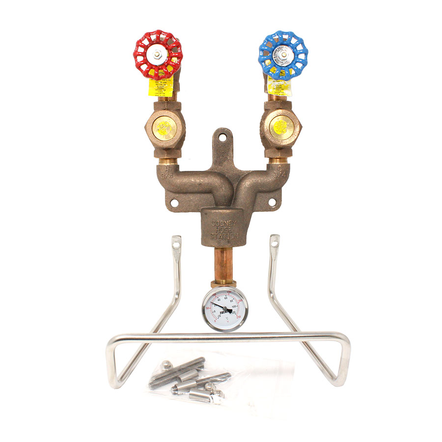 Cooney CHS-EM Econo Mix Washdown Station with Temp Gauge, for Mixing Hot and Cold Water. Comes with Stainless Steel Hose Rack, 150# Check Valves, 125# Globe Valves, and Mounting Hardware.