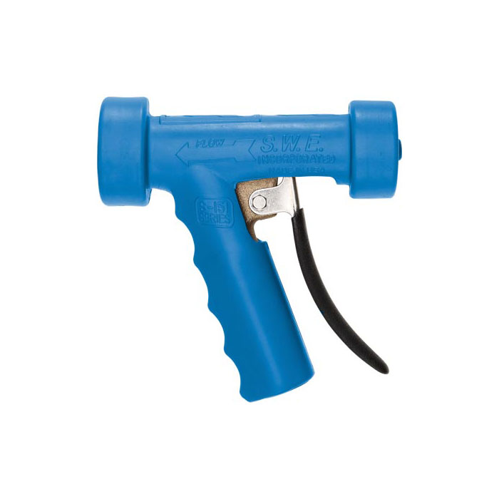 Model S151BL Bronze Spray Nozzle is designed and constructed to withstand the daily demand and severe service conditions that exist in large industrial food processing environments. Its bronze and stainless steel construction ensure reliable performance and extended product life. It features a variable spray pattern that adjusts from a soft spray to a solid stream simply by depressing the lever. You are assured of drip-tight shutoff upon release of the lever. The rear mounted lever helps to ease operation during extended periods of use and reduces finger cramping. Stainless Steel seats ensure long life.