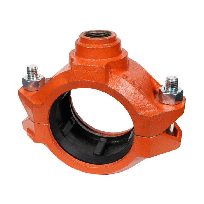 The Gruvlok® FIG 7042 Outlet Coupling is designed to join two sections of grooved end pipe and form a reducing outlet connection. The outlet couplings are available for the 1-1/2 in through 6 in IPS or ISO run pipe sizes with the outlet pipe sizes ranging from 1/2 in through 2 in. The gaskets are available in EPDM and Nitrile to suit a wide range of applications. The gasket design is a unique pressure responsive design that provides a higher sealing force as pressure is increased. The outlet gasket seal is reinforced by a steel ring and is mated to a machined housing surface to assure a leak-tight outlet seal. Center ribs inside the gasket ease positioning of the pipe during installation and provide additional support to the gasket. The outlet couplings are NOT recommended for vacuum applications or for use with bevelled end pipe.