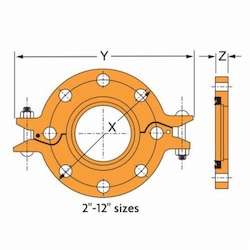 The Gruvlok® Fig. 7012 Flange allows direct connection of Class 125 or Class 150 flanged components to a grooved piping system. The two interlocking halves of the 2 thru 12 in sizes of the Gruvlok® Flange are hinged for ease of handling, and are drawn together by a latch bolt, which eases assembly on the pipe. Precision machined bolt holes, key and mating surfaces assure concentricity and flatness to provide exact fit-up with flanged, lug, and wafer styles of pipe system equipment. A specially designed gasket provides a leak-tight seal on both the pipe and the mating flange face. The 14 thru 24 in sizes of the Gruvlok® Fig. 7012 Flange are cast in four segments. A sleek profile gasket design allows quick and easy assembly of the Gruvlok® Flange onto the pipe. All Gruvlok® Fig. 7012 Flanges have designed-in anti-rotation tines which bite into and grip the sides of the pipe grooves to provide a secure, rigid connection. The Gruvlok® Fig. 7012 Flange requires the use of a steel adapter insert when used against rubber faced surfaces, wafer/lug design valves and serrated or irregular sealing surfaces. In copper systems a phenolic adapter insert is required, in place of the steel adapter insert.