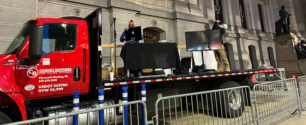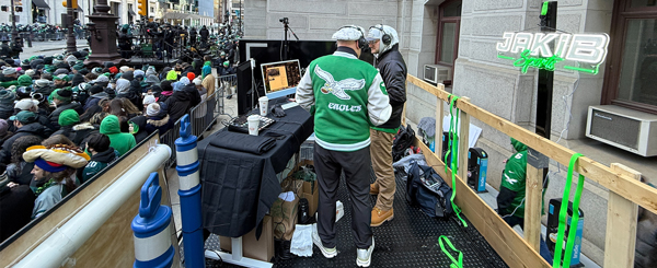 The energy at the parade was truly unforgettable, and we consider ourselves lucky to have been a part of it. Philly roots run deeply in the Cooney Brothers story. Since our founding in 1937, we were located in Philadelphia for 60 years before moving to our current location in Plymouth Meeting. We take pride in having served the city and tri-state area in every way we can for almost 90 years now. No matter what we are working on, we solve the community’s most unique problems by providing expert, creative solutions. So, when Joe Krause, founder of JAKIB Sports, came to us for help with their live broadcast from City Hall, we were ready to ‘swoop’ in and get the job done. Fast.
