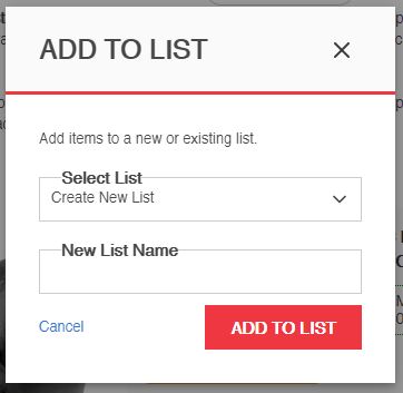 To create a list, find a product you wish to add, and click on the gray “ADD TO LIST” button on the Product Detail Page or from the blue “ADD TO LIST” link throughout the site. The Add To List pop-up appears immediately, where you will be prompted to create a new list by naming it.