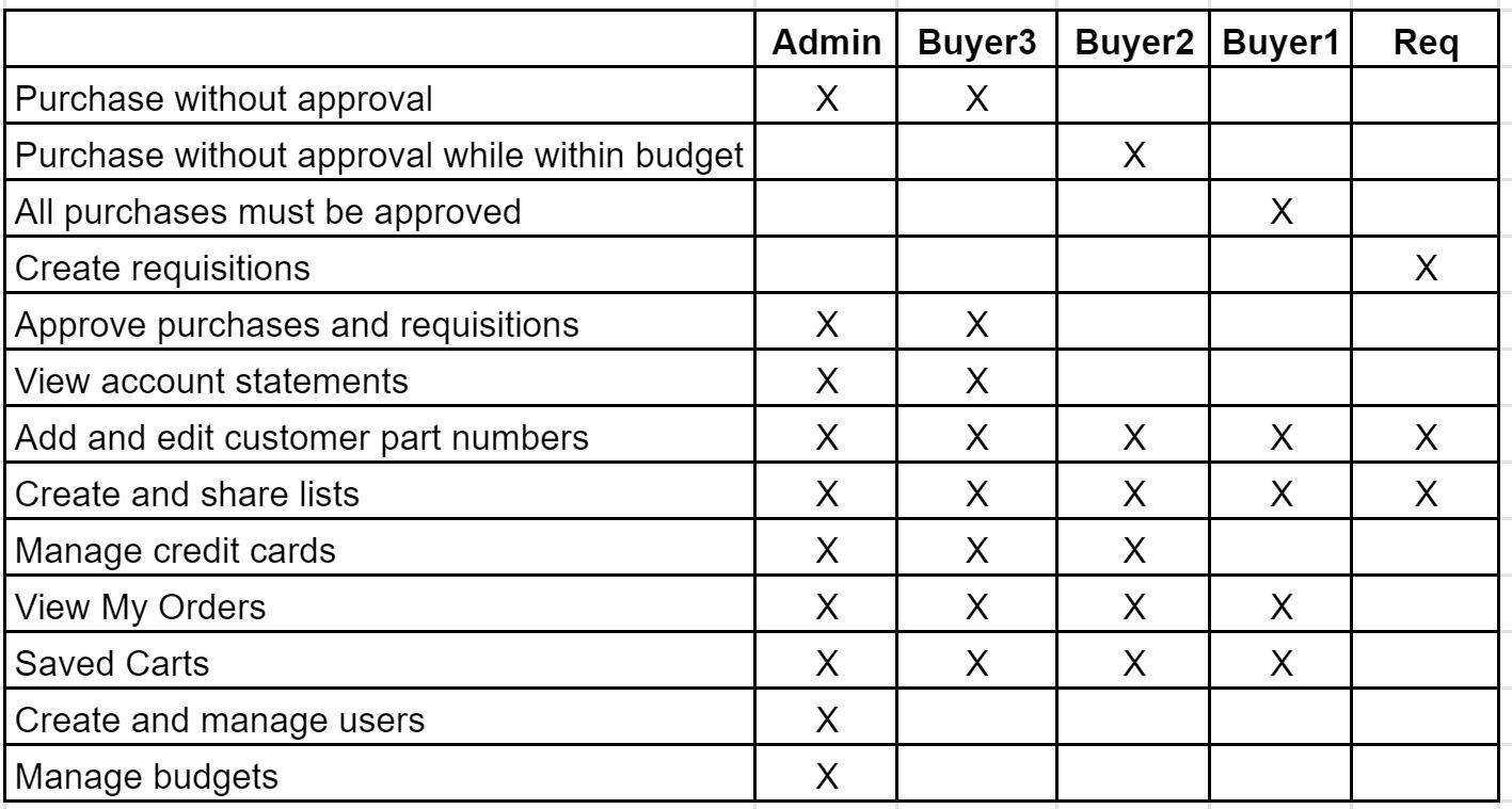 An Administrative User has full control over other the users within their organization. They can create new users, edit users, and remove users. Admin Users can set the appropriate level of access for all their users by assigning roles, which controls who can buy, what locations they can buy for, and what ship-tos are available to each user. They also have the ability to set company wide purchasing budgets or budgets per buyer or shipping location.