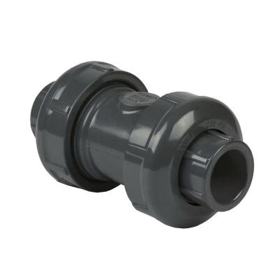 All thermoplastic check valves shall be True Union Ball type constructed from PVC Type I, ASTM D1784 Cell Classification 12454 or CPVC Type IV, ASTM D1784 Cell Classification 23447. All O-rings shall be EPDM or FKM. All valve union nuts shall have Buttress threads. All valve components shall be replaceable. All EPDM valves shall be certified by NSF International for use in potable water service. All 1/2 to 2 in valves shall be pressure rated at 235 psi and all 2-1/2 to 6 in and all flanged valves shall be pressure rated at 150 psi for water at 73 deg F, as manufactured by Spears® Manufacturing Company.