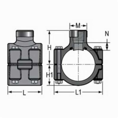Spears® Pipe Saddle, Clamp-On, 4 x 1-1/2 in Nominal, Special Reinforced FNPT Connection, 1-3/4 in Diameter Hole, SCH 80/XH Schedule, 235 psi Pressure, 73 deg F, Zinc Bolt, PVC Clamp, 5-9/16 in W Dimensions, Gray, Domestic/Import: Domestic