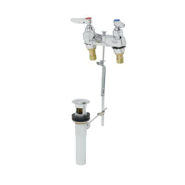 T & S Lavatory Faucet, 2.2 gpm Flow Rate, 4 in Center Distance, Integral Spout, 3-3/4 in Spout Reach, 1-7/16 in Spout Height, Lever Handle, Pop-Up Drain, 1/2 in Connection, Male NPSM Connection, Spray Pattern: Aerator, 1-1/4 in Maximum Deck Thickness, Deck Mounting, Spring Check Valve/Quarter Turn Eterna Compression Cartridge, 8-5/8 in L x 3-5/16 in H Dimensions, Brass, Polished Chrome