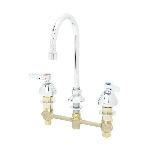T & S Concealed Widespread Lavatory Faucet, 2.2 gpm Flow Rate, 8 in Center Distance, Rigid/Swivel Gooseneck Spout, 5-3/4 in Spout Reach, 6-1/4 in Spout Height, Lever Handle, 1/2 in Connection, MNPT Connection, Spray Pattern: Aerator, 1-1/4 in Maximum Deck Thickness, Deck Mounting, Spring Check Valve/Quarter Turn Eterna Compression Cartridge, 12-5/8 in L x 10-11/16 in H, Forged Brass, Polished Chrome