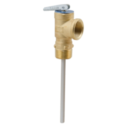 Series 100XL Temperature and Pressure Relief Valves are used in water heater and hot water storage tank applications to provide automatic temperature and pressure protection to hot water supply tanks and hot water heaters up to 105,000 BTU/hr. They feature a bronze body with NPT male inlet and NPT female outlet connections, unique thermostat with special thermo-bonded coating, and a test lever. Model 100XL-8 is also available with 8 in. (200mm) extension thermostat. Series 100XL is ASME rated and CSA listed. Temperature Relief: 210 deg F (99 deg C), Pressure Relief Range: 75 to 150psi (5.2 to 10.3 bar), Standard Pressure Settings: 75, 100, 125, or 150psi (5.27, 7.03, 8.79, or 10.55 bar).