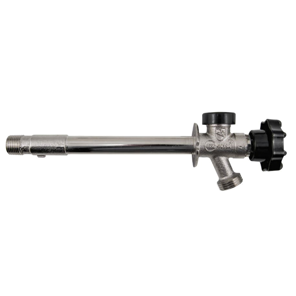 This 10 in lead free frost proof automatic draining wall hydrant is used in commercial and residential applications to provide freeze protection for the external water supply. It also includes a lead free brass vacuum breaker to provide backflow protection to the potable water supply. Designed for easy field service with a replaceable bibb washer to allow for repair inline without removing sill cock from the water line. This wall hydrant consists of a lead free brass body with nickel plated finish, 0.8 mm thick copper tube, allows for 1/2 in solder or male IPS inlet, 3/4 in hose outlet, and a steel hand wheel.